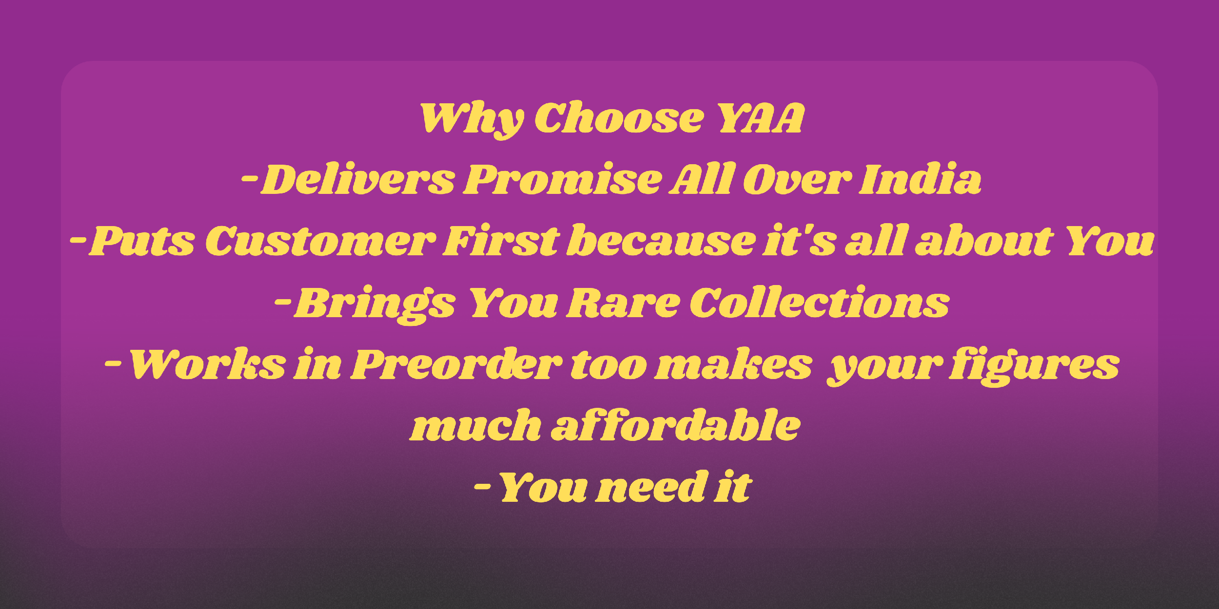 If you’re into anime, Marvel, or anything pop culture, you just found your new favorite store. YAA Store got premium figurines, posters, katanas, cosplay costume, and a whole lot more— We’re fans just like you, and we know the thrill of finding that perfect piece for your collection. So whether you’re hunting for a rare find or just want to deck out your space, we got you. Because let’s be real—YOU ARE AWESOME, and your collection should be too. Always Remember That #You Are Awesome