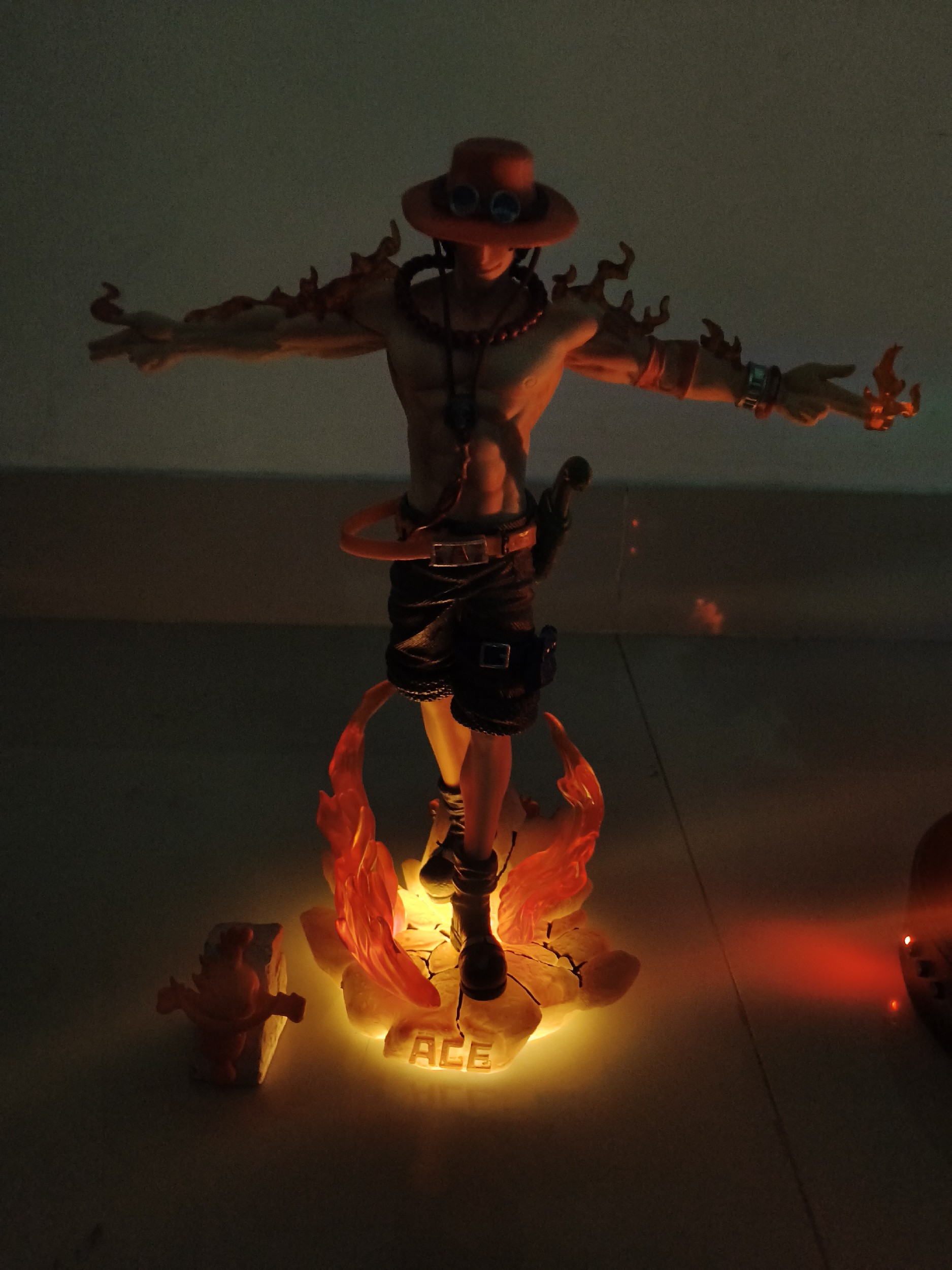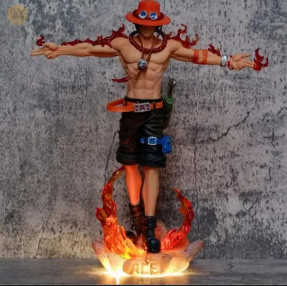 This is a detailed action figurine of Portgas D. Ace from the _One Piece_ series, shown shirtless with a red hat, goggles, and flame-themed accessories. The statue depicts Ace in a dynamic pose with fiery effects swirling around his arms and base, suggesting his fire Devil Fruit powers. The LED-lit base adds a dramatic “ACE” glow to the display.